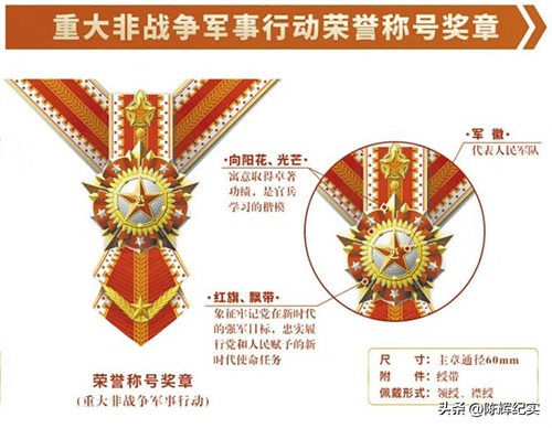 和平使命纪念章。颁发给执行联合国维持和平行动、联合反恐、联合军演、援外活动等军事任务的军官、文职干部和士兵。”