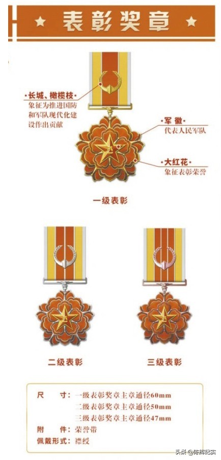 表彰奖章,由主章和荣誉带组成,主章由军徽、大红花等元素构成,分为一级表彰、二级表彰、三级表彰奖章,主章通径分别为60mm、50mm、47mm。