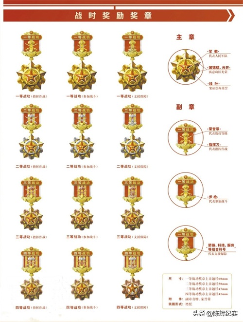 战时奖励奖章,分为一等战功、二等战功、三等战功、四等战功奖章,主章通径分别为60mm、50mm、47mm、45mm,区分指挥作战、参加战斗、支援保障3种情形。