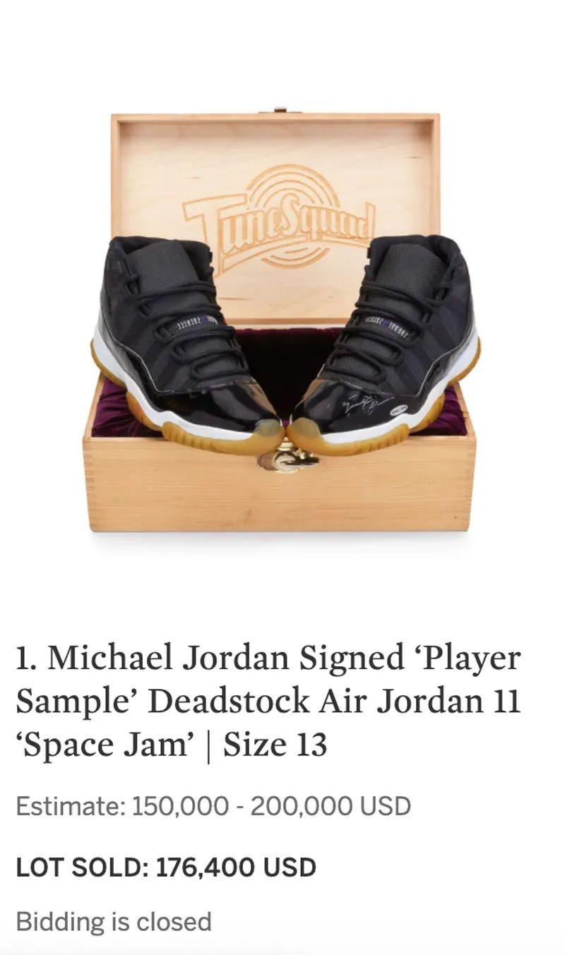前段时间苏富比拍卖行就上架了一双乔丹亲签的大灌篮 Air Jordan 11 “Space Jam” 球员 Sample 版本,尺码为 US13,而且是全新品相。