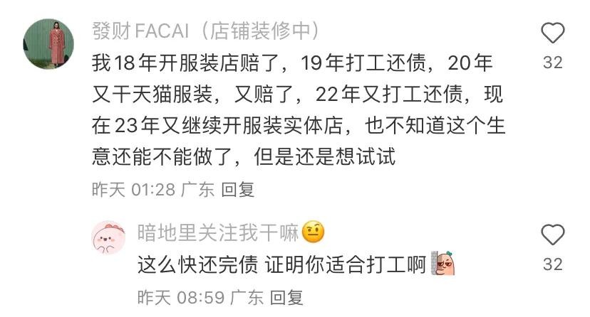 做生意赔了,于是打工还债,几次循环,跟服装生意死磕上了。网友:还债这么快?看来你适合打工