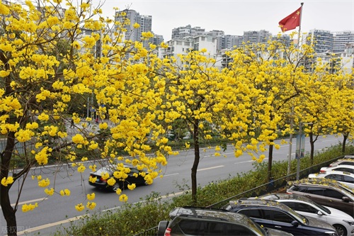 但是它为什么叫做风铃木呢?是因为它的形状和颜色,现在是三月,是风铃花的旺季,在朋友圈,短视频,各大平台随处可见,今年的黄花风铃木开得比往年都要旺盛。