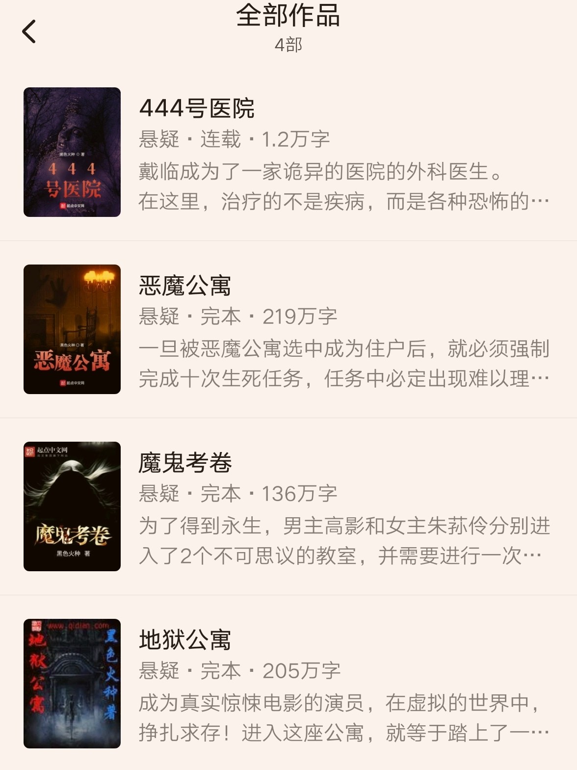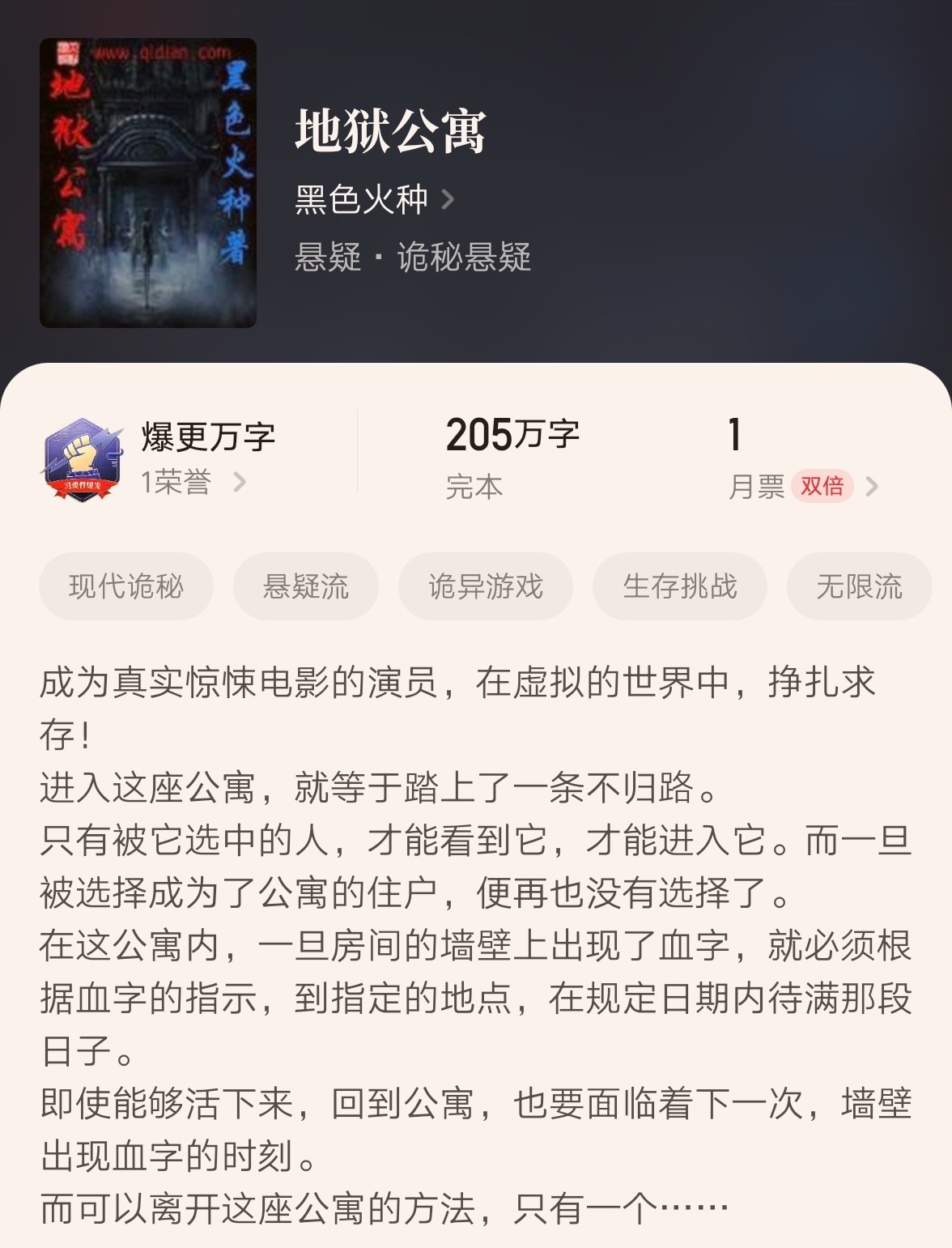 黑色火种以一本名为《地狱公寓》的小说而打出名气。小说打造了一个进入就要完成任务才能出来的惊悚公寓。主角就在这样一个公寓里不断地打工,也不断地与鬼邂逅,斗智斗勇,剧情烧脑惊悚预料不及,多个故事串联,给你一种永远不知道接下来会发生什么的感觉。