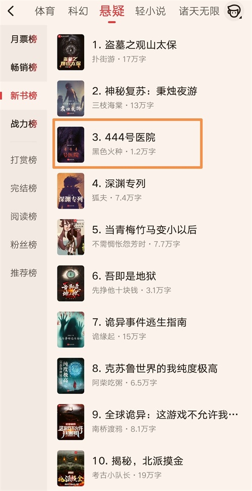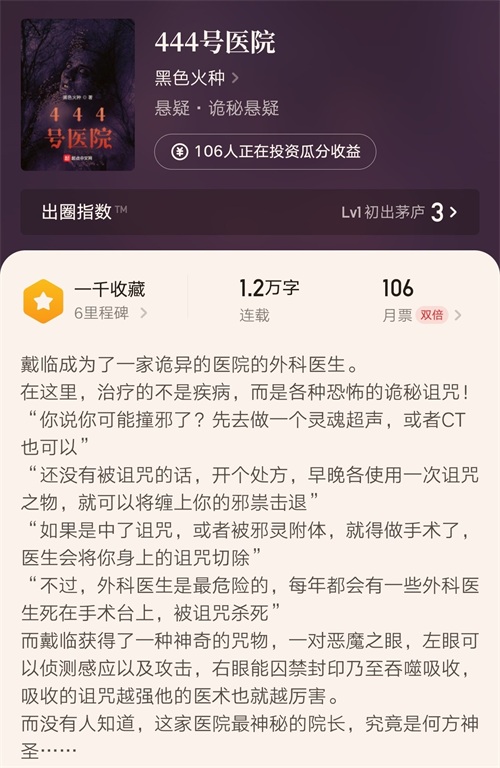 各式各式的诅咒在这个医院里被吸引被治愈,过程真是看得人浑身发毛。小说气氛妥妥的到位了!目前这本小说刚刚发布就排在起点悬疑频道新书榜第三。还是挺有潜力的。