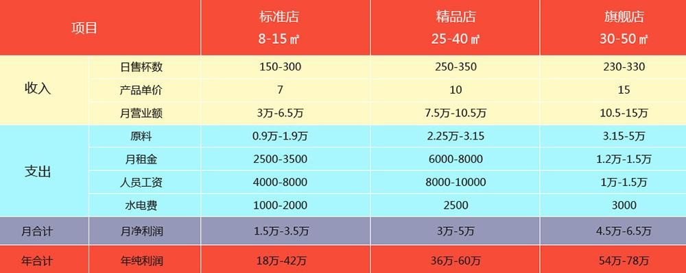 以产品口味大众化、店铺大小适中,装修没有太大的特色的店铺来说。开在热闹的商圈、繁华的步行街、城市最中心的商场,业绩是最好的,店租高达1.5万到两万不等,每天平均售出400-500杯,平均每月的业绩达12-15万以上。