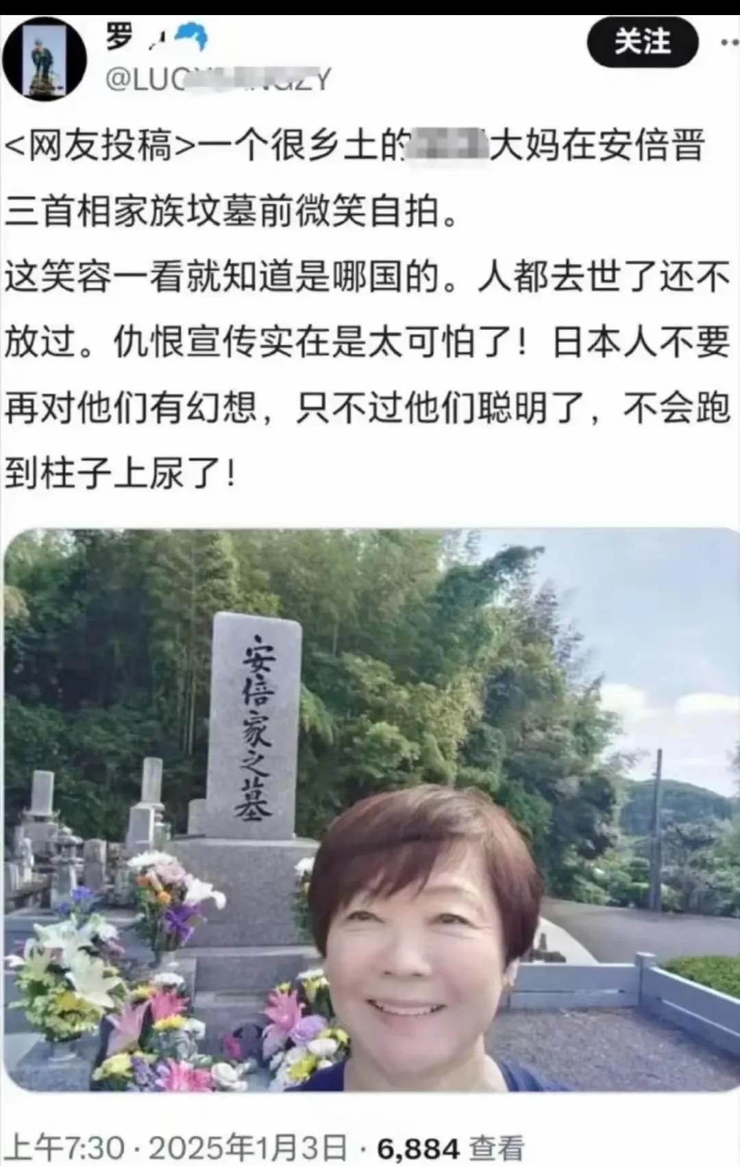 某位伪精看到有个大妈在安倍晋三的家族幕前自拍,特别是脸上的笑容让他很不爽,于是一顿输出,且用词相当考究,例如:一个很乡土的;这笑容一看就知道是哪国的;人都去世了还不放过等等。