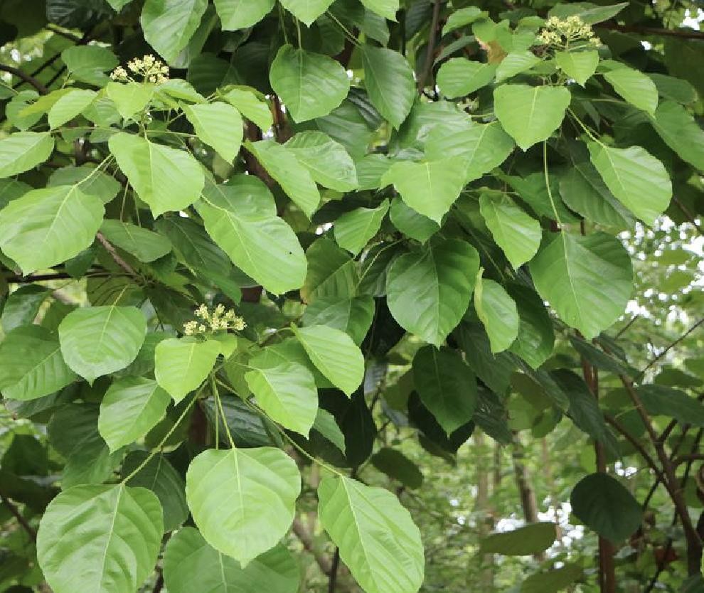 落叶乔木(高可达25米),树皮平滑;小枝圆柱形,无毛;叶片纸质,呈卵形或长圆卵形,先端钝尖具尾状尖尾,上面深绿色,下面脉腋具黄色丛毛;伞房花序,花黄绿色,花瓣长圆倒卵形或倒披针形,花药黄色,花柱细瘦。中国特有物种,分布于四川。