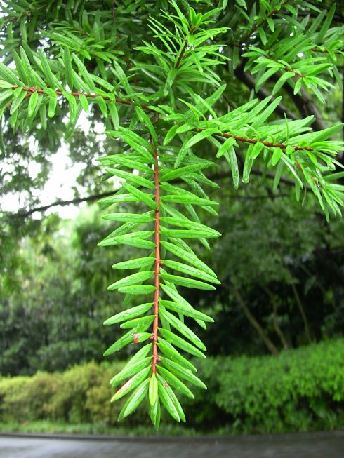 灌木(高可达4米),树皮灰褐色;叶片呈条形,排列成两列,先端凸尖,有短柄,上面光绿色,下面有两条白色气孔带。分布于浙江、江西、湖南、广东、广西及杭州。