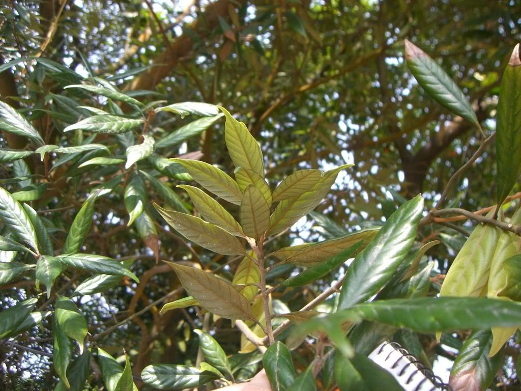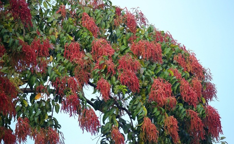 常绿乔木(高达25-35米);小枝圆柱状,被褐色短绒毛或变无毛;叶厚纸质,呈长椭圆形,全缘或微波状,偶有粗齿,顶端有一短而偏斜的尖头,基部钝圆;叶柄较粗;大型圆锥花序,顶生或腋生,花小且多,红色。分布于广西、云南、西藏。