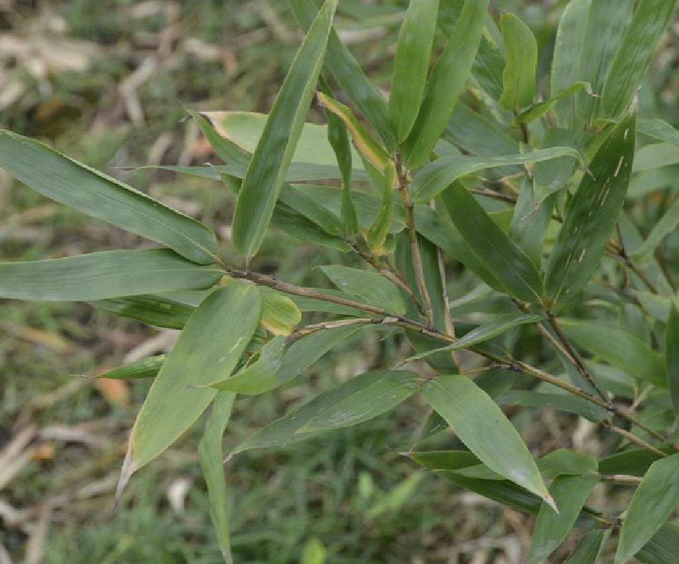 禾本科酸竹属植物(竿高8米),绿色,幼时密披短刺毛,后脱落而留有毛痕;叶片呈长圆状披针形,无毛;花枝顶生,小穗含小花8-9朵。分布于中国广东。