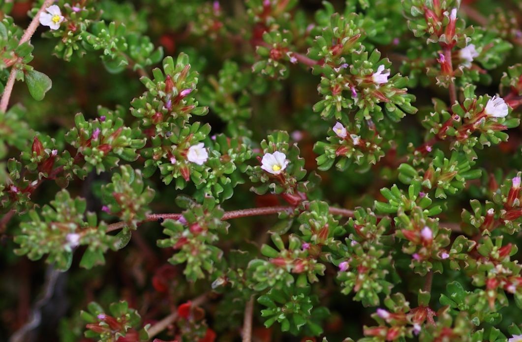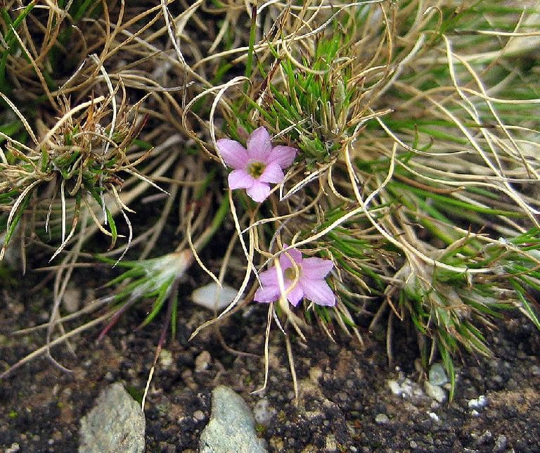 一年生草本(高6-16cm),平卧,茎从基部多分枝,常呈二歧状分枝;叶小,呈狭倒卵形或倒卵形,通常4叶轮生;花小,多单生,稀数朵生于叶腋或小枝顶端,无梗;蒴果长圆状卵形。分布于新疆、甘肃和内蒙古。