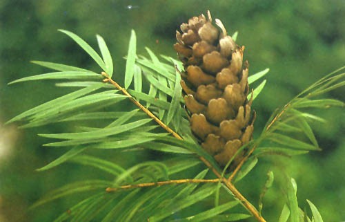 乔木(高达30米),树皮淡灰色或灰色,裂成薄鳞状块片脱落;大枝平展,侧枝细而下垂,一年枝淡黄色或淡褐黄色,有毛或无毛,二、三年枝褐黄色或褐色,渐变成灰色;条形,扁平,微弯或直,先端尖或微尖,上面有2条白粉气孔带,下面光绿色,无气孔线;球果矩圆状圆柱形或圆柱形,成熟前红褐色、紫褐色或深褐色。分布于云南、四川。