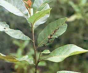 乔木(高约15米),树皮平滑,具白色斑块,具白色芳香树脂;叶革质,全缘,呈卵形至卵状披针形;圆锥花序腋生或顶生,纤细,少花,被疏毛或近于无毛。分布于海南。