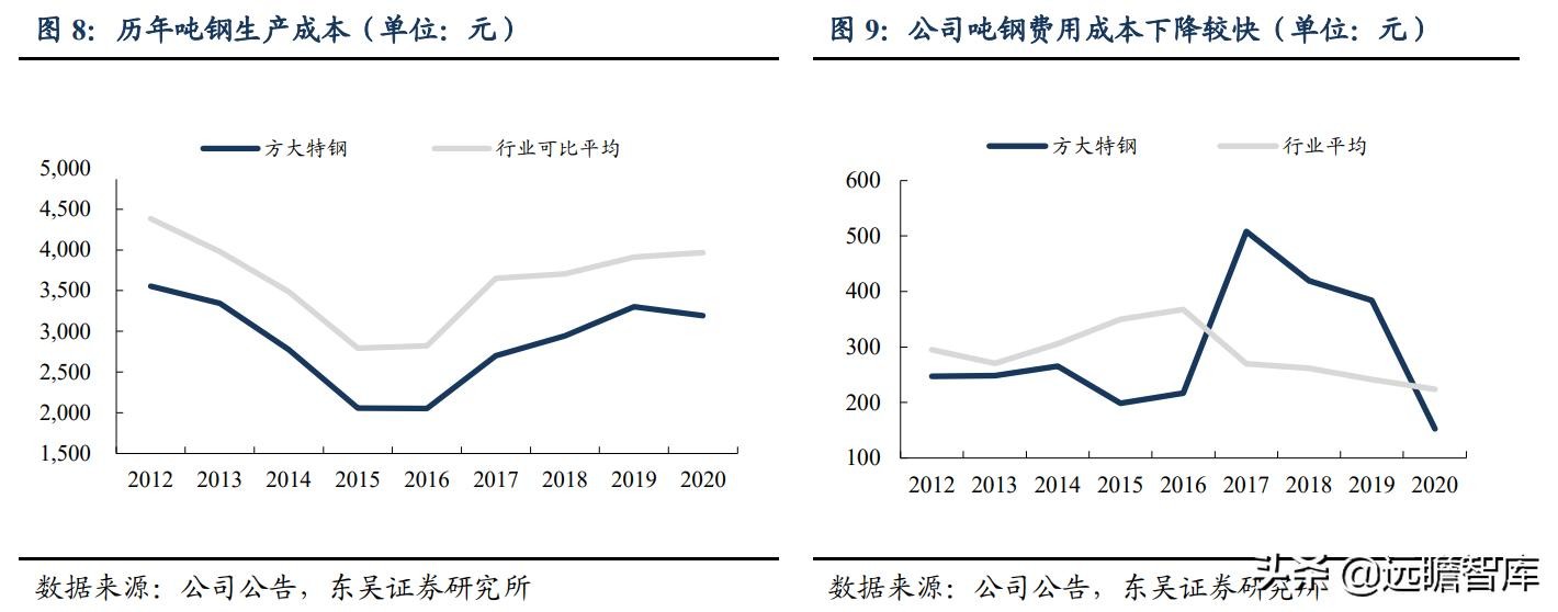 在生产成本与期间费用同时控制实现严格控制的策略下,方大特钢近年来长期处于远低于行业平均成本水平的优势地位。