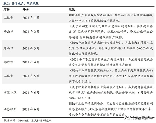 2020年,工信部于年底重点提到,围绕碳达峰、碳中和目标节点,实施工业低碳行动和绿色制造工程,钢铁行业作为能源消耗高密集型行业,要坚决压缩粗钢产量,确保粗钢产量同比下降。此外各省也出台了各项对钢铁行业的限产政策: