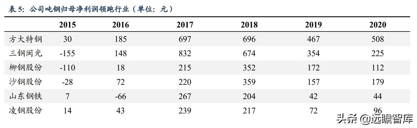 自 2018 至 2020 年,方大特钢吨钢归母净利润持续保持行业第一,较当年行业平均水平高近 300 元。