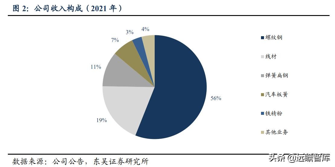 从产品种类来看,公司的现阶段主要收入来源为长材类(螺纹钢、线材)产品,2021年收入结构中螺纹钢为 56%,线材占比 19%;弹簧扁钢和汽车板簧产品在收入中占比分别为 11%、7%。