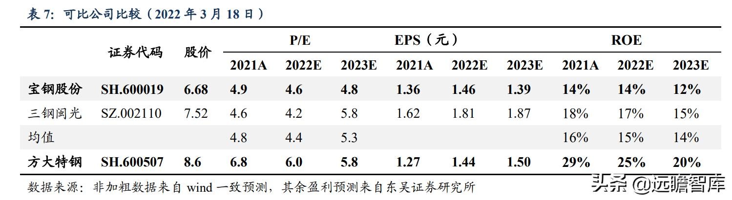 此处管理水平、吨钢盈利能力同样优异的宝钢股份和三钢闽光作为可比公司,2022-2023 年 PE 均值为 4.4/5.3x。