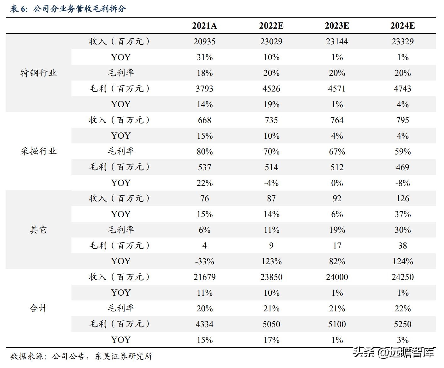 4)由于铁矿石等成本让利,我们预计公司特钢行业毛利率在 2022-2024 年稳步提升、采掘行业毛利率缓慢下降。