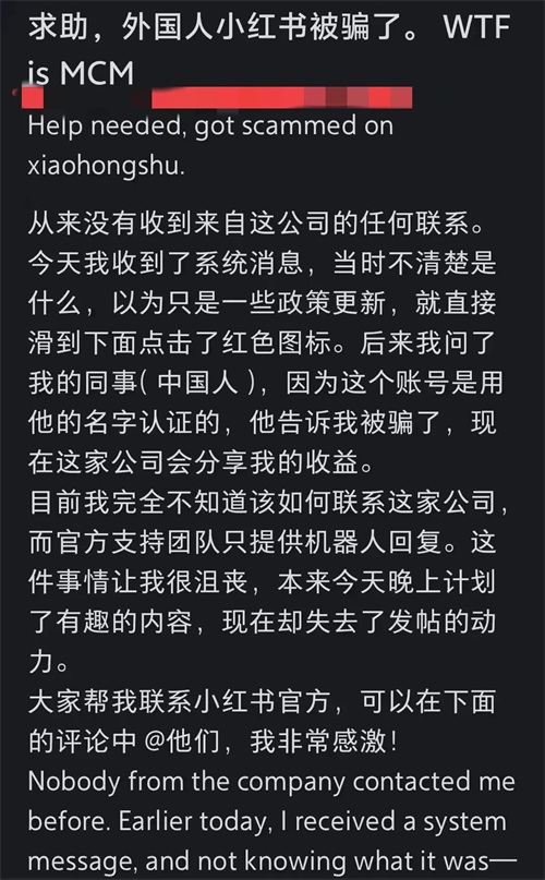 一位刚入驻小红书的美国友人,在短短几天内就不幸被骗加入了一家MCN机构。