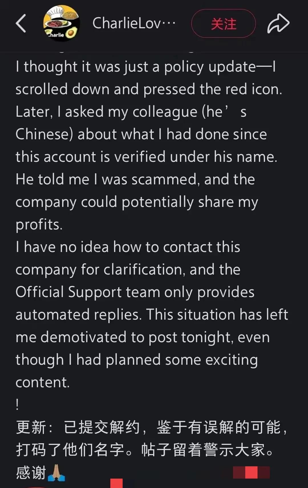 他在尝试联系该公司却得不到回应,瞬间失去了继续分享的动力,随后他在自己小红书上发帖求助,寻求解脱之法。