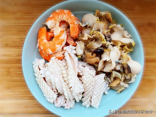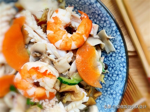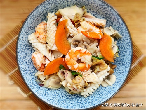 【食材】虾仁、鱿鱼、海螺、口蘑、黄瓜、胡萝卜
