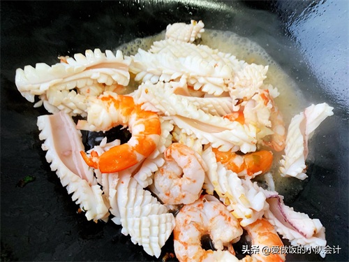 5、海鲜易熟,不宜炒的时间过长,所以要大火快炒,快速成菜。