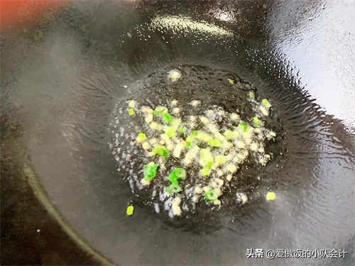 3、锅烧热倒入食用油,下葱花、姜粒爆香。