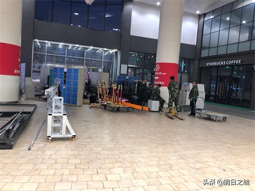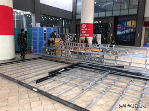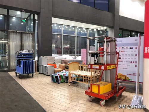 大门口堆满了撤柜的装修展架、货架等用品,搬家工人来来往往地紧张忙碌着。