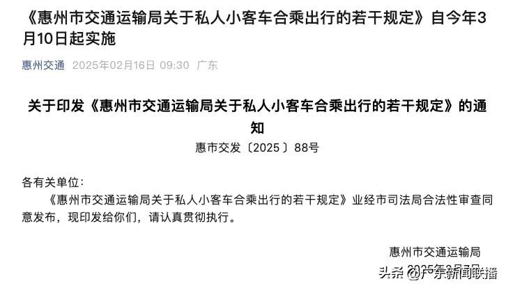 2月16日,据惠州市交通运输局官方微信公众号“惠州交通”消息,为规范私人小客车合乘(俗称“拼车”“顺风车”)行为,保障合乘各方合法权益,惠州市交通运输局于2025年2月7日正式印发《关于私人小客车合乘出行的若干规定》(以下简称《规定》),明确合乘服务性质、平台责任及费用分摊标准,并划定与非法营运的界限。新规将于2025年3月10日起实施,有效期3年。