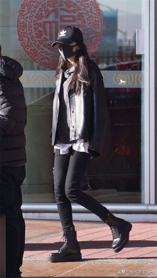 杨幂的这一造型以一件黑色皮夹克为主,内搭白色T恤,下搭牛仔裤,脚踩黑色马丁靴。这种搭配既时尚又酷炫,展现了她的个性与魅力。