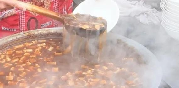 小摊老板用一个大木勺或者是用一个大水瓢,两三下一碗胡辣汤就端到餐桌上了。