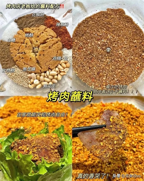 两勺白芝麻、三勺辣椒面、两勺孜然粒、一块桃酥、半勺花椒、两勺花生、半勺五香粉、半勺糖/盐/鸡精,混合均匀。家庭烤肉必备,蘸啥都好吃,丰富口感让烤肉更具魅力。