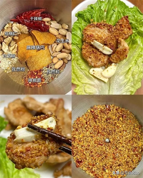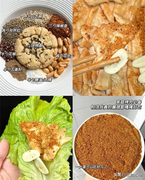 花椒粉、辣椒粉、桃酥、白糖、鸡精+盐、孜然粉、熟芝麻、熟花生,打碎成粉。每次吃烤肉,这款干蘸料都是灵魂所在,酥脆口感与香辣味道,让人在家就能实现烤肉自由。