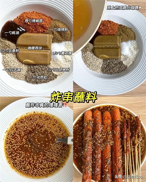 两勺辣椒面、一勺蚝油、一勺烧烤粉、两块咖喱、1/3勺五香粉、1/3勺糖鸡精、一勺白芝麻、一勺孜然粒、1/3勺白胡椒粉,淋上热油,咖喱与香辣融合。蘸炸串时,浓郁的味道瞬间提升炸串的美味度。