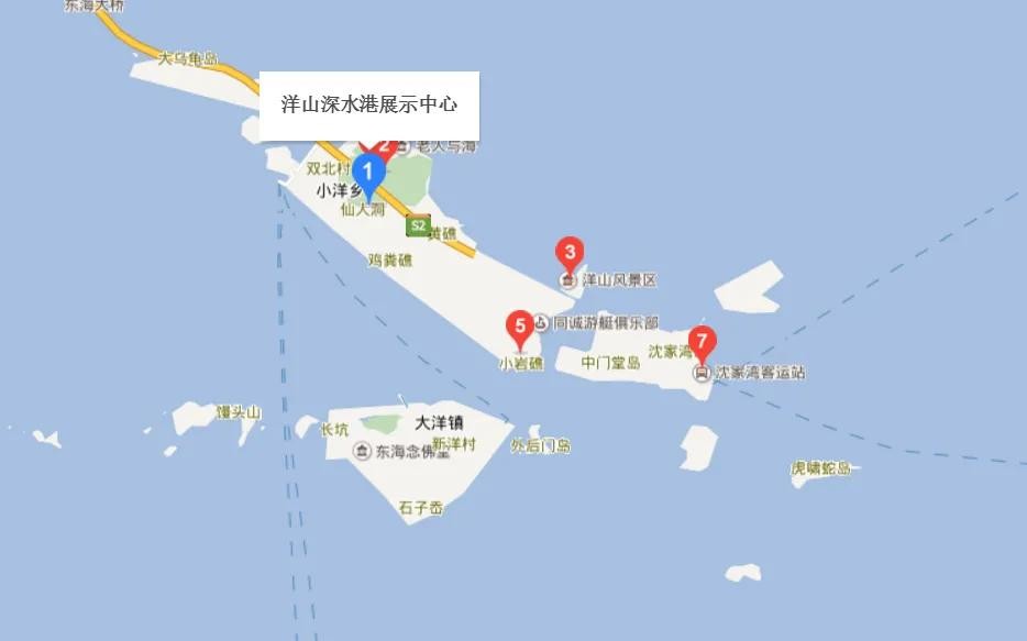 上海洋山深水港位于杭州湾口外的崎岖列岛,由小洋山岛域、东海大桥、洋山保税港区组成,于2005年12月10日开港,在业务上属于上海港港区,行政区划属于浙江省舟山市的嵊泗县。洋山港港区规划总面积超过25平方公里,包括东、西、南、北四个港区,按一次规划,分期实施的原则,自2002年至2020年分四期建设。