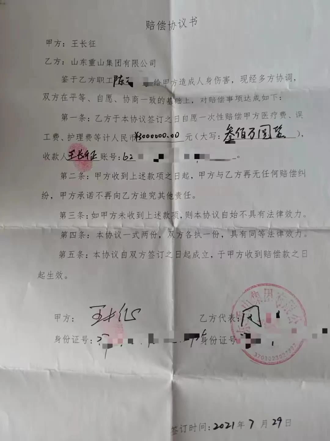 这场暴力事件引发了广泛关注,最终在淄博市淄川区信访局、罗村镇政府等单位的协调下,山东重山集团与王长征签订了《赔偿协议书》,向其支付了高达300万元的人身损害赔偿。这一巨额赔偿,似乎是对王长征多年举报环保问题的肯定与补偿。