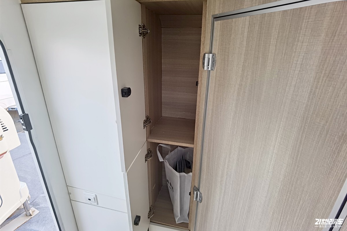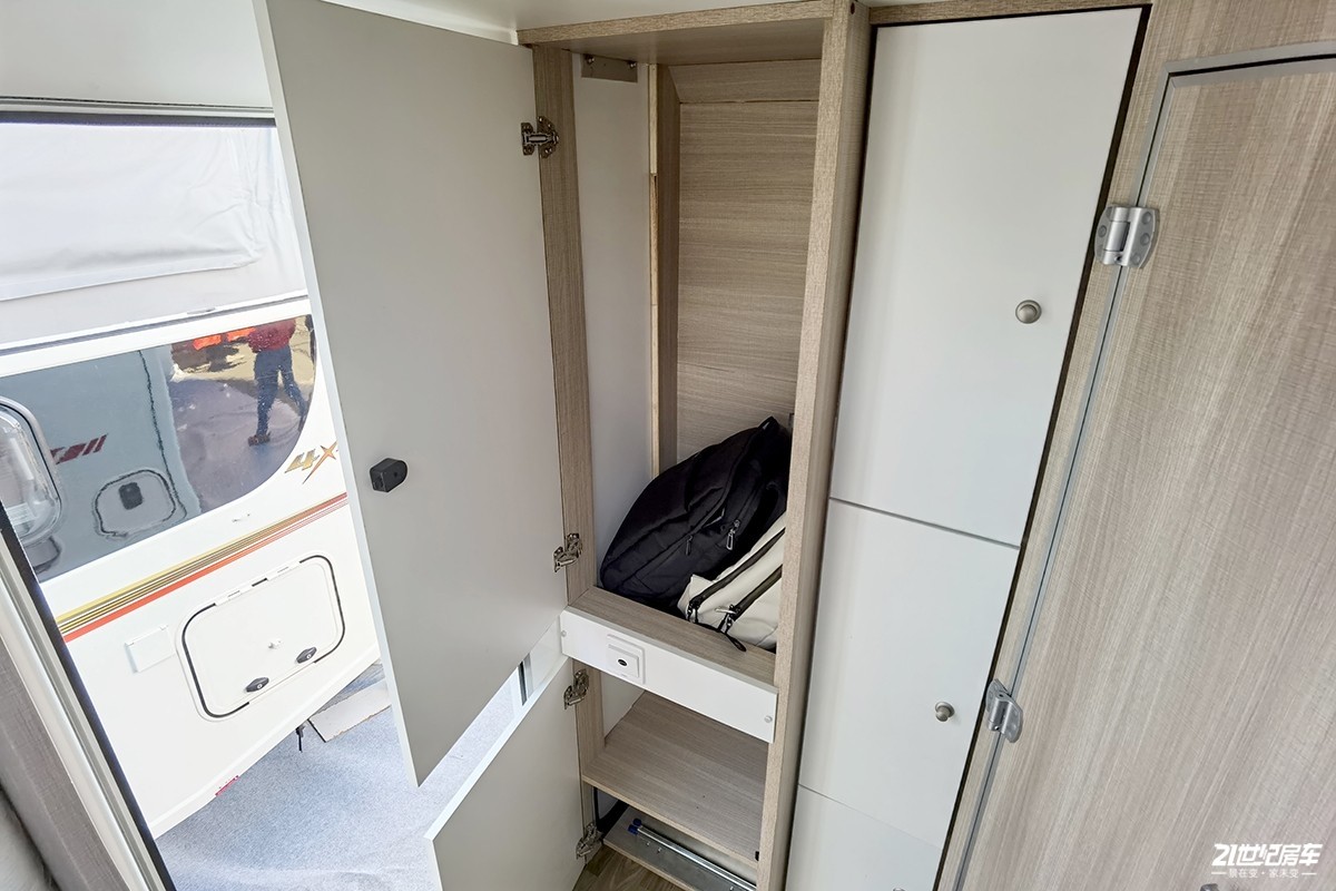 车尾部分除了卫生间占用了一部分以外,该部分都是储物空间,包含衣柜和多个立式储物格。