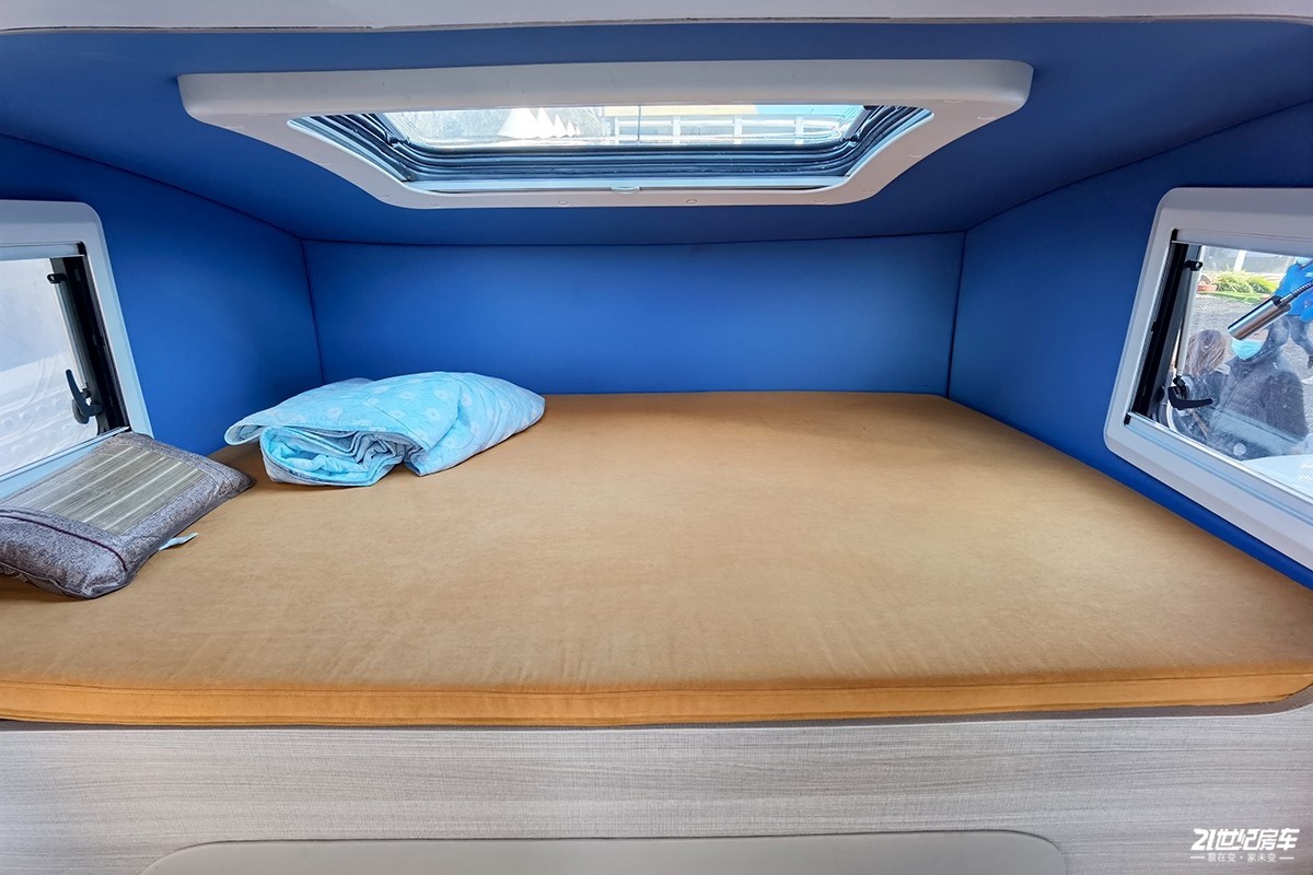 额头床这款床位是整车的唯一款固定床(厂家没有给出具体尺寸,目测有2米长和1.3米宽),两侧带有侧窗,顶部开设有天窗,不论是采光还是通风都是有保障的。