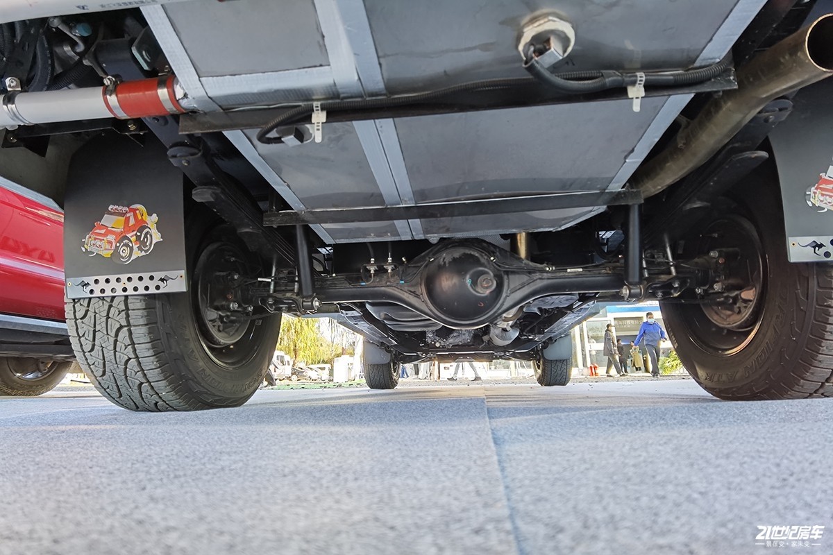 车尾部分做了一个非常的切角来增加离去角,车底我们可以看到采用的是整体桥+钢板弹簧悬挂的形式,非承载式车身具备一定的承重能力。