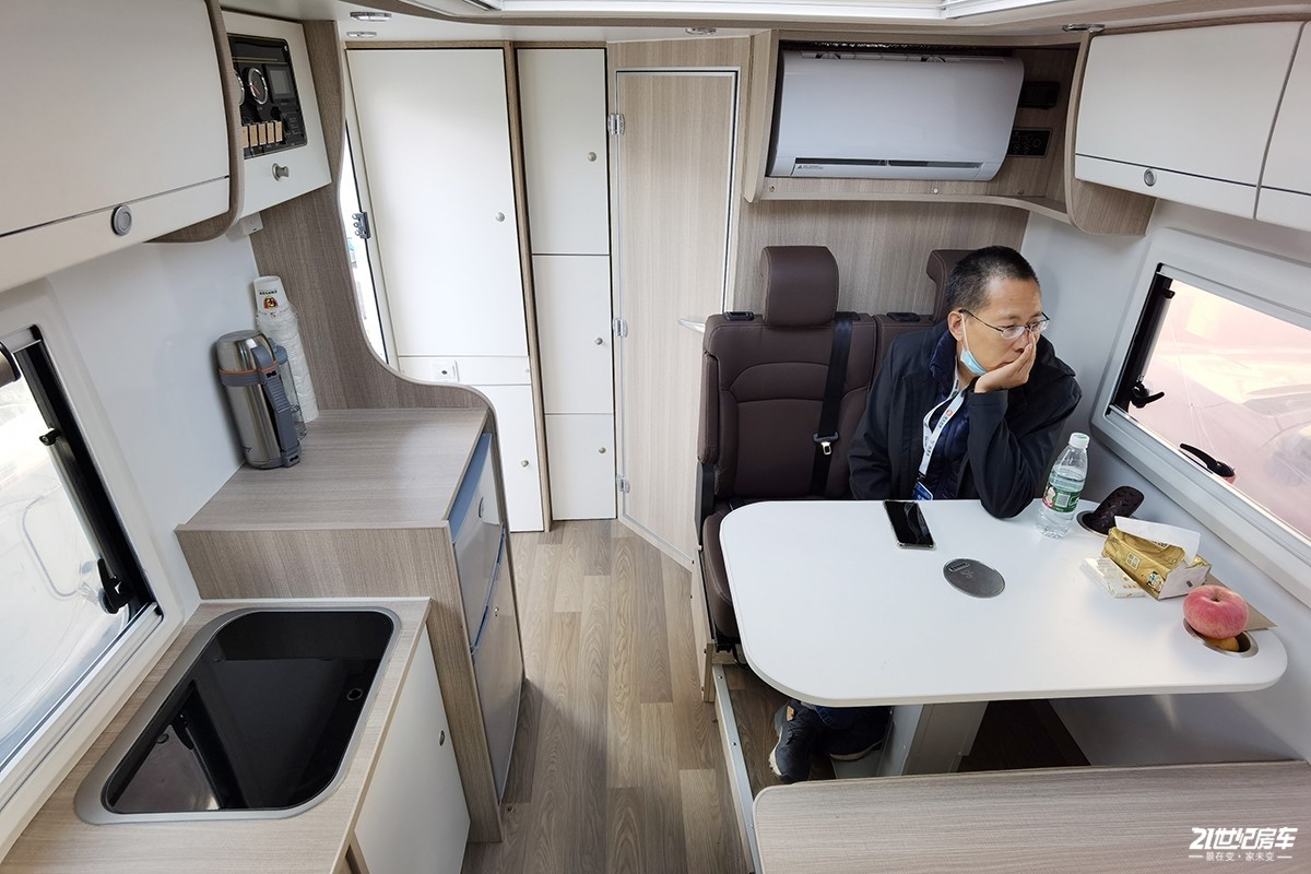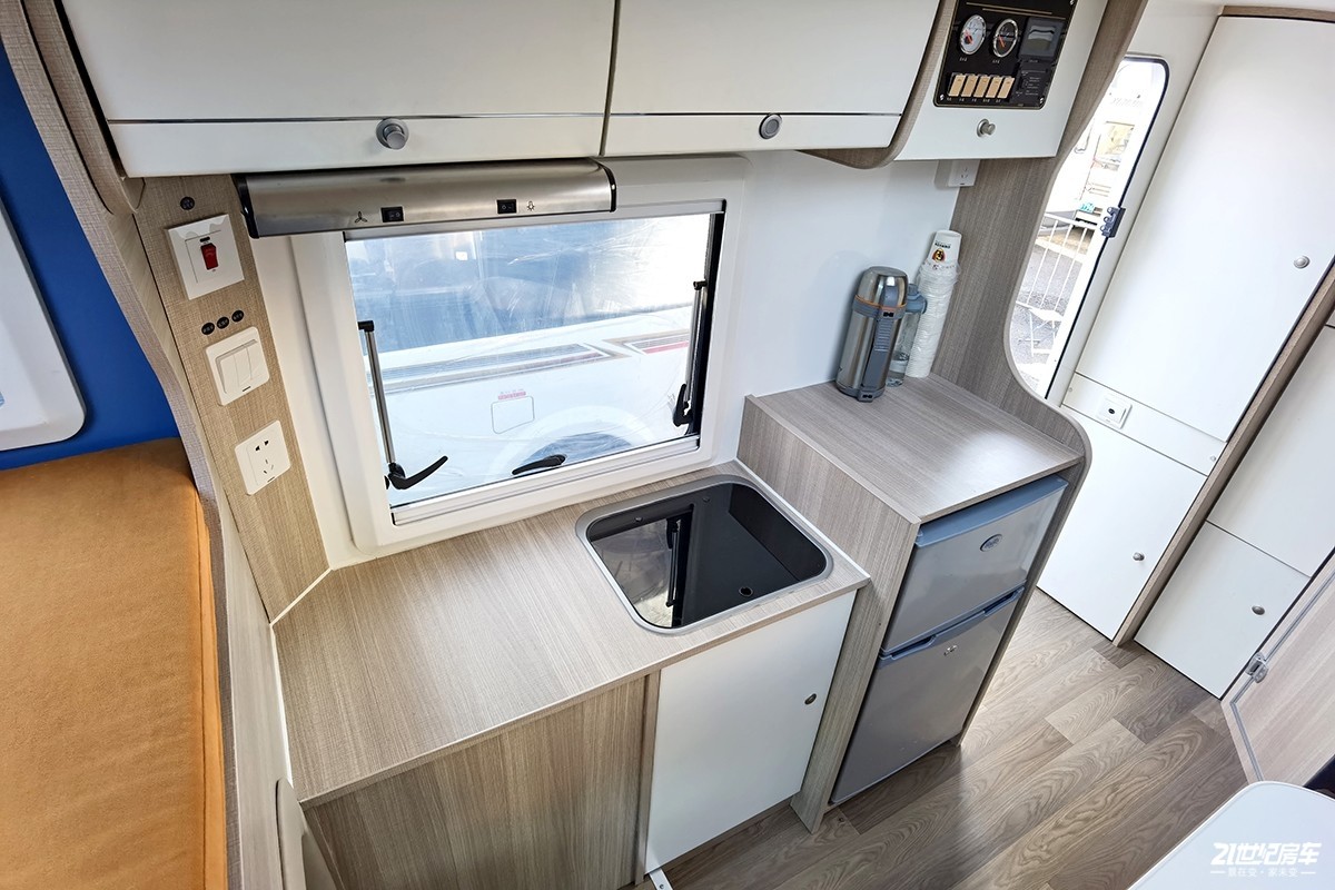 根据车内空间比例来看,厨房区着实不算小,由于侧窗和冰箱集成原因,整个台面未能形成同一高度。橱柜顶部配备了一款抽油烟机,厨房收纳空间也相对丰富。