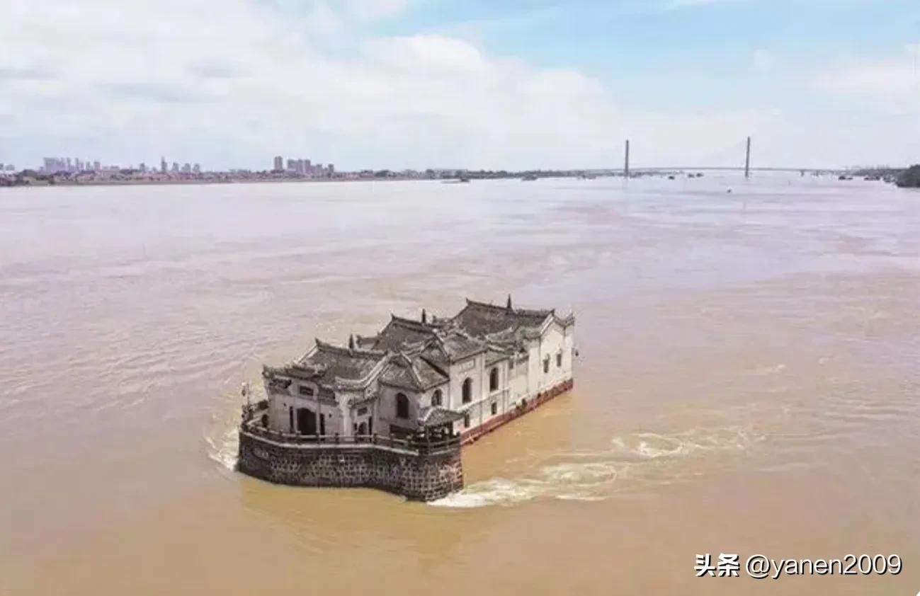 网上找到一张长江流域进入洪水期,观音阁抵挡洪水猛兽的照片。