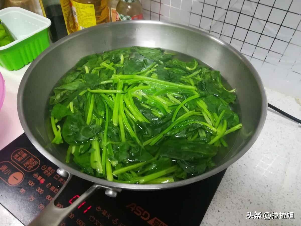 面团发酵的时间,开始调馅料。把青菜洗干净,放入开水中焯水,在焯水过程中,加入适量的小苏打,可以保持菜叶翠绿色;