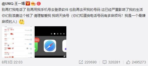 日前,青年演员王一博手机号码遭泄露,且被黄牛肆意贩卖。王一博发微博说,他接到了来自全国各地打来的上百个来电,恳请大家不要再打电话了,“别再用我手机号去登录软件,也别再去买我的号码,这已经严重影响了我的生活,你们别浪费这个钱了,请理智爱我。”由于不堪来电骚扰,王一博表示将不得不更换手机号码。