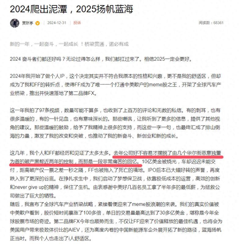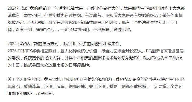 贾跃亭发文:FF被黑帮控制2年,10亿美金造不出来车不是自己原因