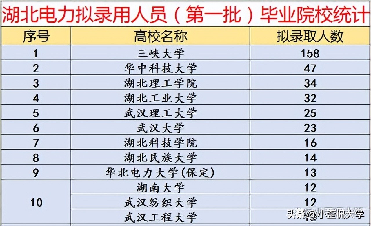 再看本省,下面这张图是2022年湖北省电力公司拟录用人员(第一批)毕业院校统计表,从中我们可以看到,当年武水一分为二,宜昌校区与三峡学院合并,组成的三峡大学拟录取158人,独霸榜首;然而正牌的武汉大学,单从人数看不说华科、武理工,还不如一些二本院校。电气工程学科早已“泯然众人矣”,实在令人扼腕叹息。