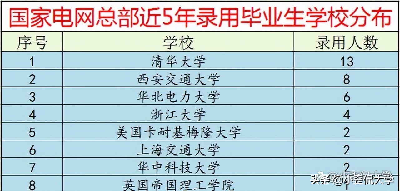 学科评估的结果也充分反映在就业上,我们以电气工程专业为例。下图是国家电网公司总部近5年招收的应届生毕业高校的情况,武大无人被录用。