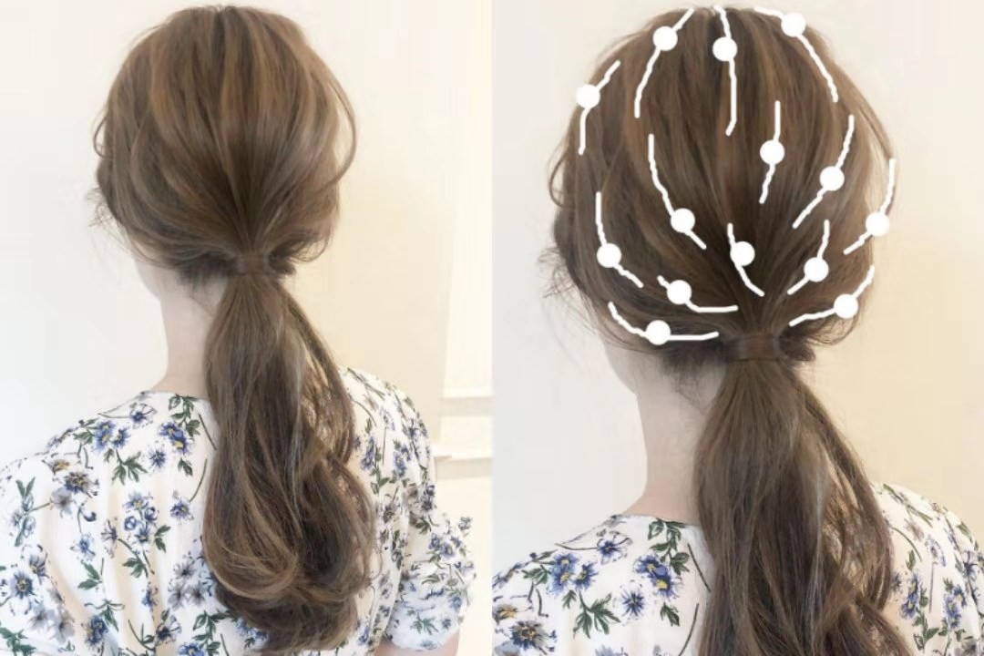 先从最基本款的低马尾变化绑起,用发圈扎成低马尾后,拉出一小段发丝缠绕一圈发圈,制造出头发发圈的视觉感,之后用小黑夹由上往下穿过发圈固定即可。