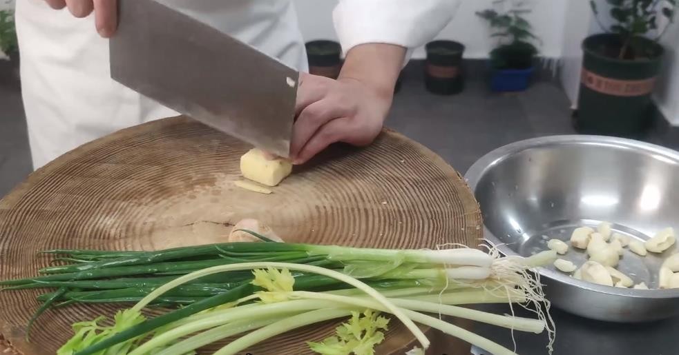 香料的准备工作:蒜子拍松即可,老姜切厚片,香葱根部洗净中间一刀两短即可,芹菜切5厘米左右的段。其余的草药香料用水洗净后温水加入适量的高白浸泡10分钟,浸泡是为了可以增加香料的香味和去除过重的药味。