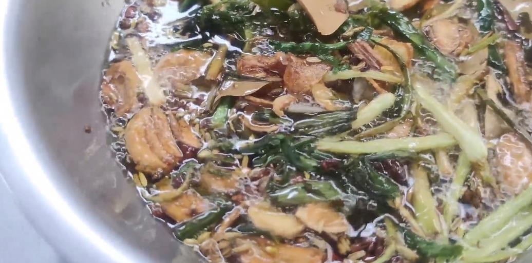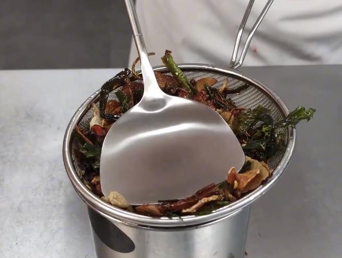 1,锅中加入色拉油2斤,油温140°先下入蒜子和姜片炸香,给油先上个底味,微黄后降低油温120°左右下入泡好的香料和剩余的蔬菜料,用小火一直浸炸(就是小火慢炸),油温不要高。